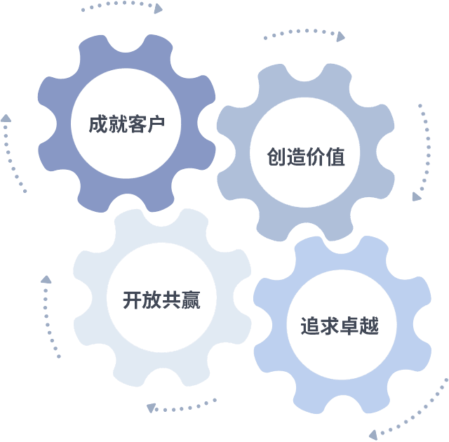 成就客户是一切决策的出发点,,,创造价值是衡量所有工作的标准,,,,追求卓越是我们做事做人的态度,,,,开放共赢是我们的格局也是最终的结果。。。价值观的齿轮环环相扣,,,推动着组织里的每个人不断向前。。